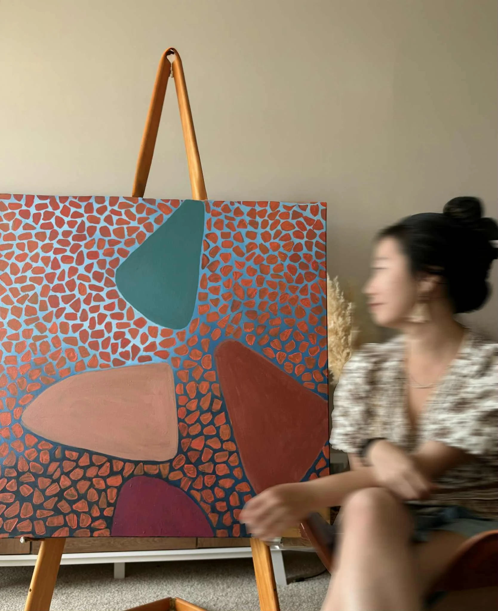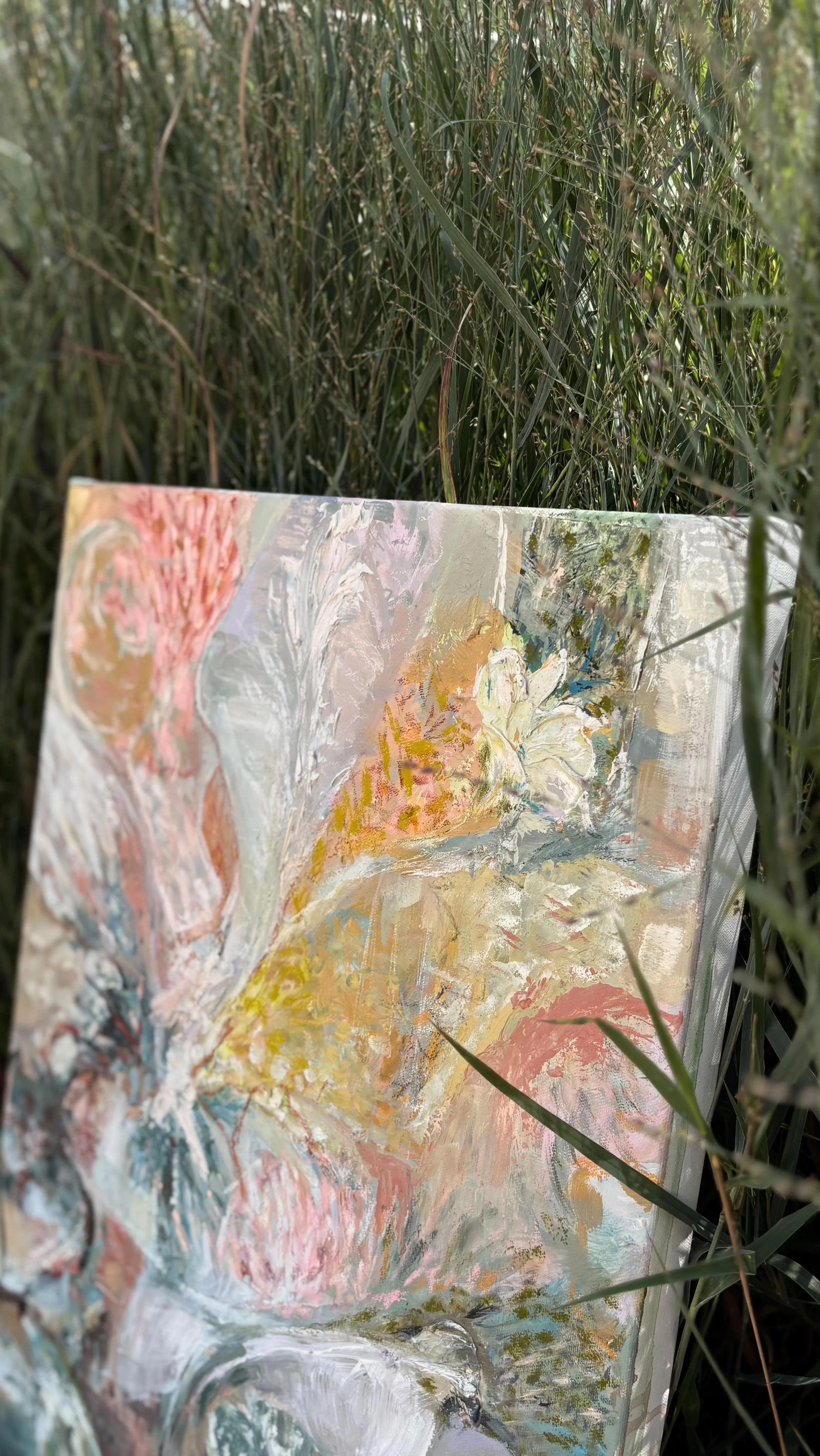 This painting is inspired by the feeling of being present in nature. Listening to the wind as it blows through the trees, seeing the flowers and buds sway in the bushes, or feeling the bumpy ground beneath my feet. Summer is one of my favorite seasons, and I love spending it in Rock Creek Park, especially on early morning jogs and walks through the wooded trails.